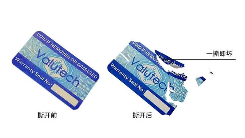易碎紙不干膠標簽是以易碎印刷材料為面料,背面涂有特種強力膠粘劑,以涂硅保護紙為底紙的一種復合防偽材料。其面料斷裂強度遠低于膠粘劑粘合能力,具有粘貼后不能完整剝離、不可再利用的特點。易碎紙不干膠標簽作為特殊工藝加工的防偽材料,抗拉強度很低,極易破碎,且具有收縮性,對溫度、濕度和儲存期有一定的要求。